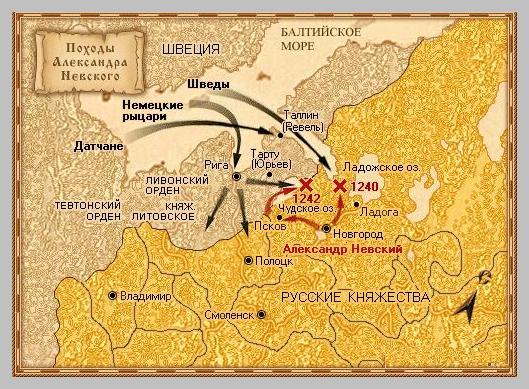 Будучи князем Новгородским (1236-1252 гг.), Александр показал себя опытным полководцем и мудрым правителем. Благодаря победам, одержанным в Невской битве (1240 г.), в Ледовом побоище (1242 г.), а также многочисленным вылазкам против литовцев, Александр остановил католическое нашествие на русские земли. (См. в хрестоматии статью «Александр Невский. Разгром шведских и немецких агрессоров на Неве и Чудском озере»).