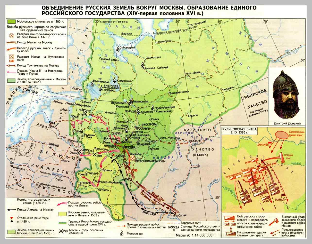 Объединение русских земель вокруг Москвы. Образование единого Российского государства (XIV - первая половина XVI вв.) // «История России». Атлас. Главный редактор Н.Н. Полункина. Отв. Ред. Атласа Е.М. Регентова. Атлас подготовлен к изданию ФГУП ПКО «Картография». М., 2004. С.6.