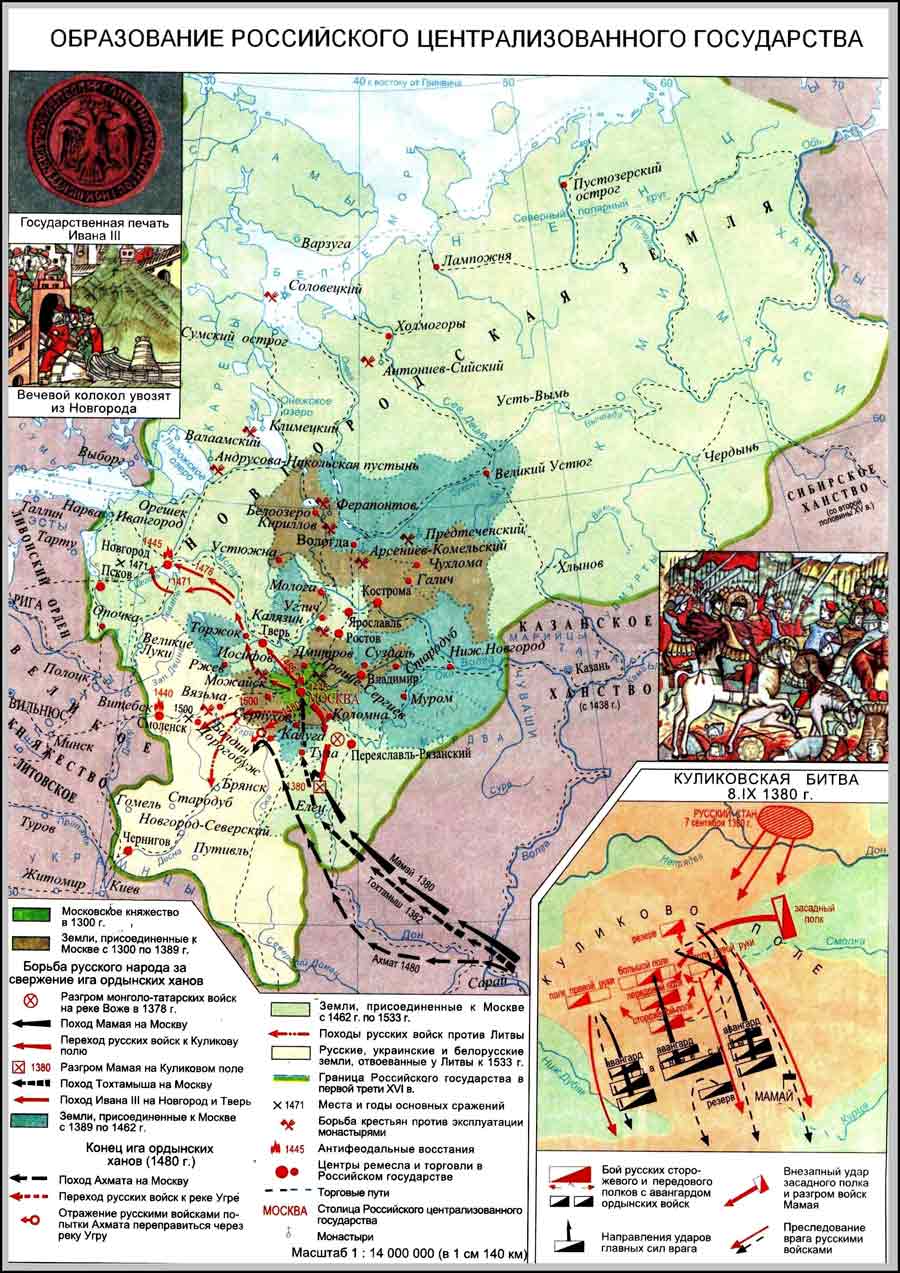 Образование Российского централизованного государства // Отечественная история с древнейших времен до конца 18 века. Атлас / Отв. ред. Е.А. Регентова. Атлас подготовлен к изданию производственно-картографическим объединением "Картография" Роскартографии. - М., 1999. - С.8.