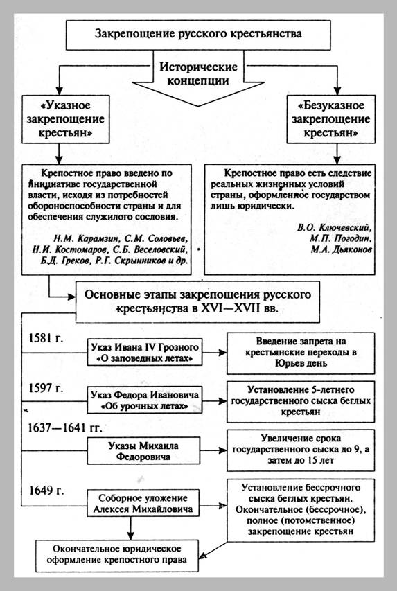 Закрепощение русского крестьянства: исторические концепции, основные этапы // Кириллов В.В. Отечественная история в схемах и таблицах. М., 2005. С. 83.