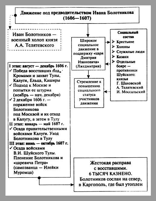 Движение под предводительством Ивана Болотникова.// Кириллов В.В. Отечественная история в схемах и таблицах/ В.В.Кириллов. 2-е изд., дополн. - М.: Изд-во Эксмо, 2005. - 320 с. - С.73