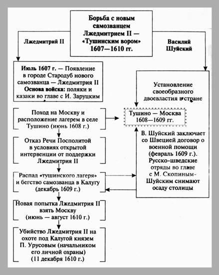 Борьба с Лжедмитрием II.// Кириллов В.В. Отечественная история в схемах и таблицах / В.В.Кириллов. 2-е изд., дополн. - М.: Изд-во Эксмо, 2005. - 320 с. - С.74
