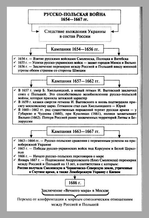 Русско-польская война 1654-1667 гг.// Кириллов В.В. Отечественная история в схемах и таблицах/ В.В.Кириллов. 2-е изд., дополн. - М.: Изд-во Эксмо, 2005. - 320 с. - С. 96