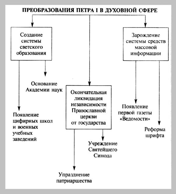Преобразования Петра I в духовной сфере // Кириллов В.В. Отечественная история в схемах и таблицах/ В.В.Кириллов. 2-е изд., дополн. - М.: Изд-во Эксмо, 2005. - 320 с. - С.116.
