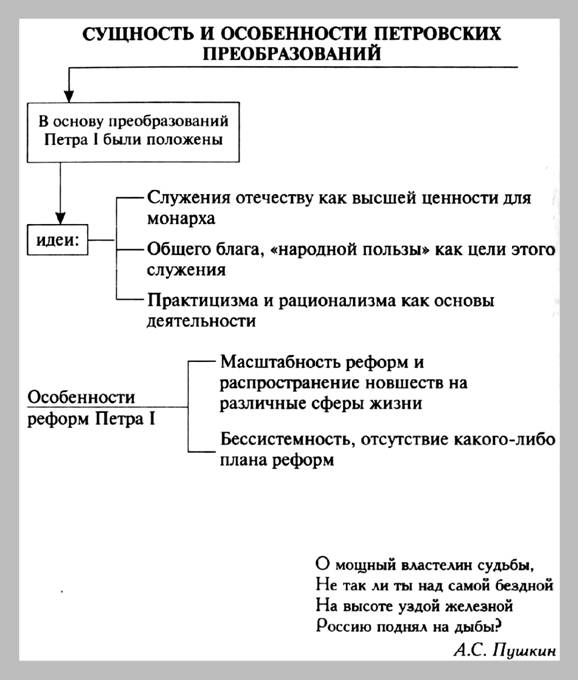 Сущность и особенности петровских преобразований. // Кириллов В.В. Отечественная история в схемах и таблицах/ В.В.Кириллов. 2-е изд., дополн. - М.: Изд-во Эксмо, 2005. - 320 с. - С. 104.