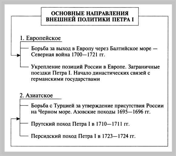 Основные направления Внешней политики Петра I. // Кириллов В.В. Отечественная история в схемах и таблицах/ В.В.Кириллов. 2-е изд., дополн. - М.: Изд-во Эксмо, 2005. - 320 с. - С. 105.