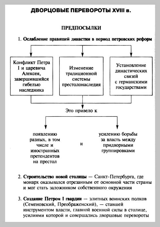Предпосылки дворцовых переворотов. // Кириллов В.В. Отечественная история в схемах и таблицах/ В.В.Кириллов. 2-е изд., дополн. - М.: Изд-во Эксмо, 2005. - 320 с. - С. 118.