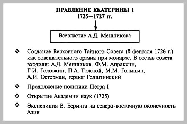 Правление Екатерины I. // Кириллов В.В. Отечественная история в схемах и таблицах/ В.В.Кириллов. 2-е изд., дополн. - М.: Изд-во Эксмо, 2005. - 320 с. - С. 119.