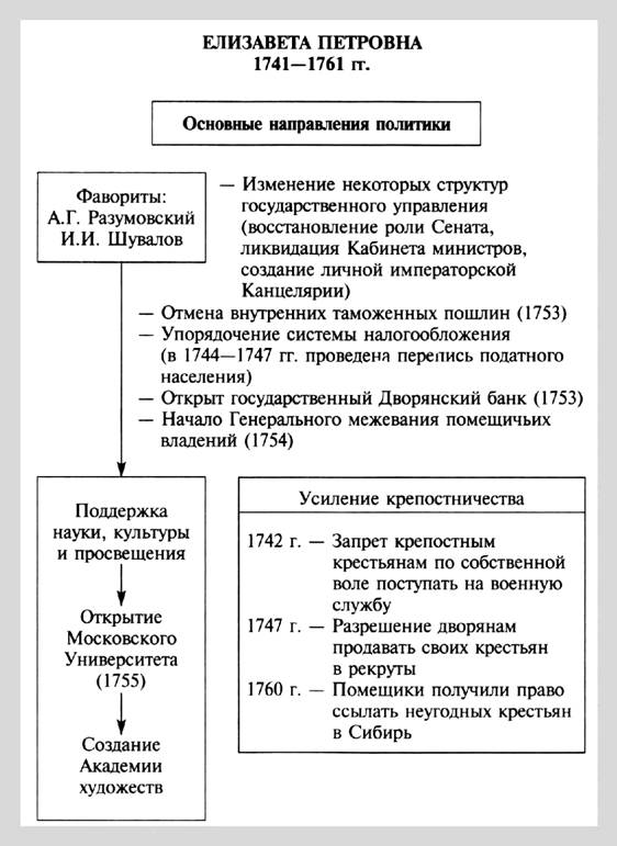 Елизавета Петровна. Основные направления политики. // Кириллов В.В. Отечественная история в схемах и таблицах/ В.В.Кириллов. 2-е изд., дополн. - М.: Изд-во Эксмо, 2005. - 320 с. - С. 122.