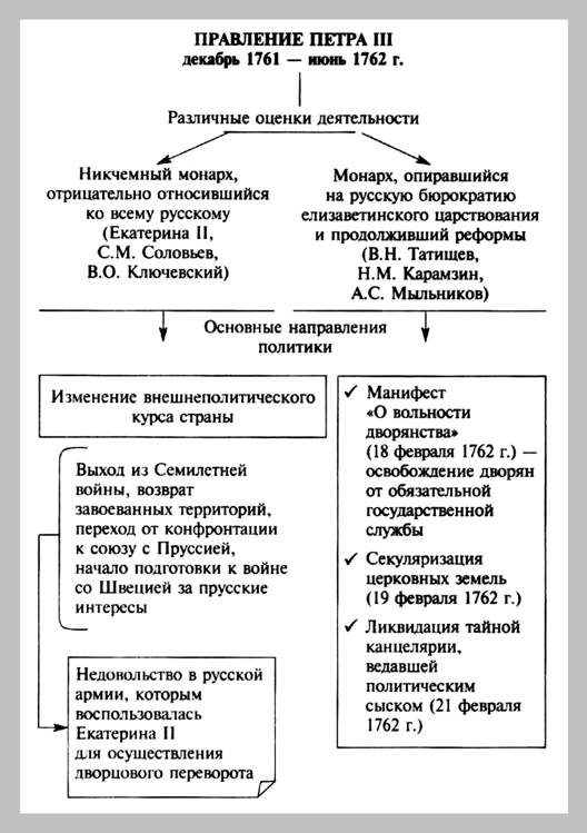 Петр III. Основные направления политики (различные оценки деятельности). // Кириллов В.В. Отечественная история в схемах и таблицах/ В.В.Кириллов. 2-е изд., дополн. - М.: Изд-во Эксмо, 2005. - 320 с. - С. 123.