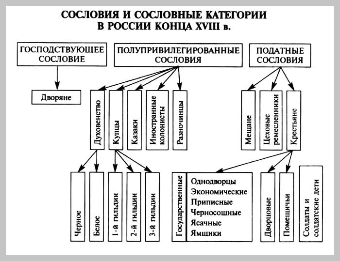 Сословия и сословные категории в России в 18 веке. // Кириллов В.В. Отечественная история в схемах и таблицах/ В.В.Кириллов. 2-е изд., дополн. - М.: Изд-во Эксмо, 2005. - 320 с. - С. 127.