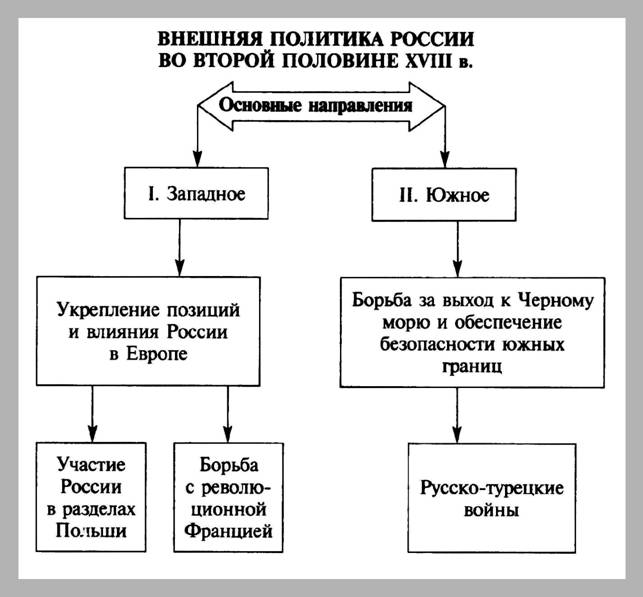 Внешняя политика России во второй половине 18 века // Кириллов В.В. Отечественная история в схемах и таблицах/ В.В.Кириллов. 2-е изд., дополн. - М.: Изд-во Эксмо, 2005. - 320 с. - С. 131.