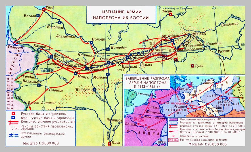 Отечественная война 1812 г.: изгнание Наполеона // «История России». Атлас. Главный редактор Н.Н. Полункина. Отв. Ред. Атласа Е.М. Регентова. Атлас подготовлен к изданию ФГУП ПКО «Картография». М., стр. 22.