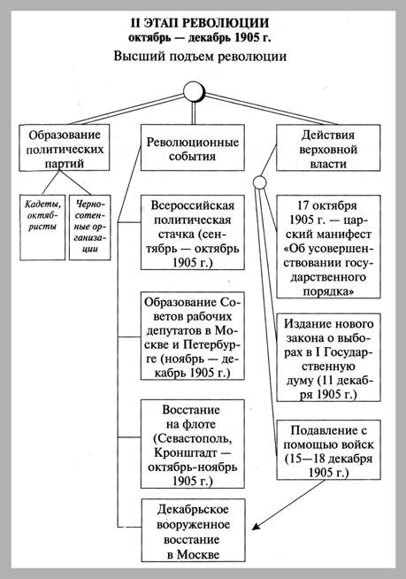 Революция 1905-1907 гг. (этапы) // Отечественная история в схемах и таблицах/ В.В. Кириллов. 2-е изд., дополненное М., Эксмо, 2005. С.208-209