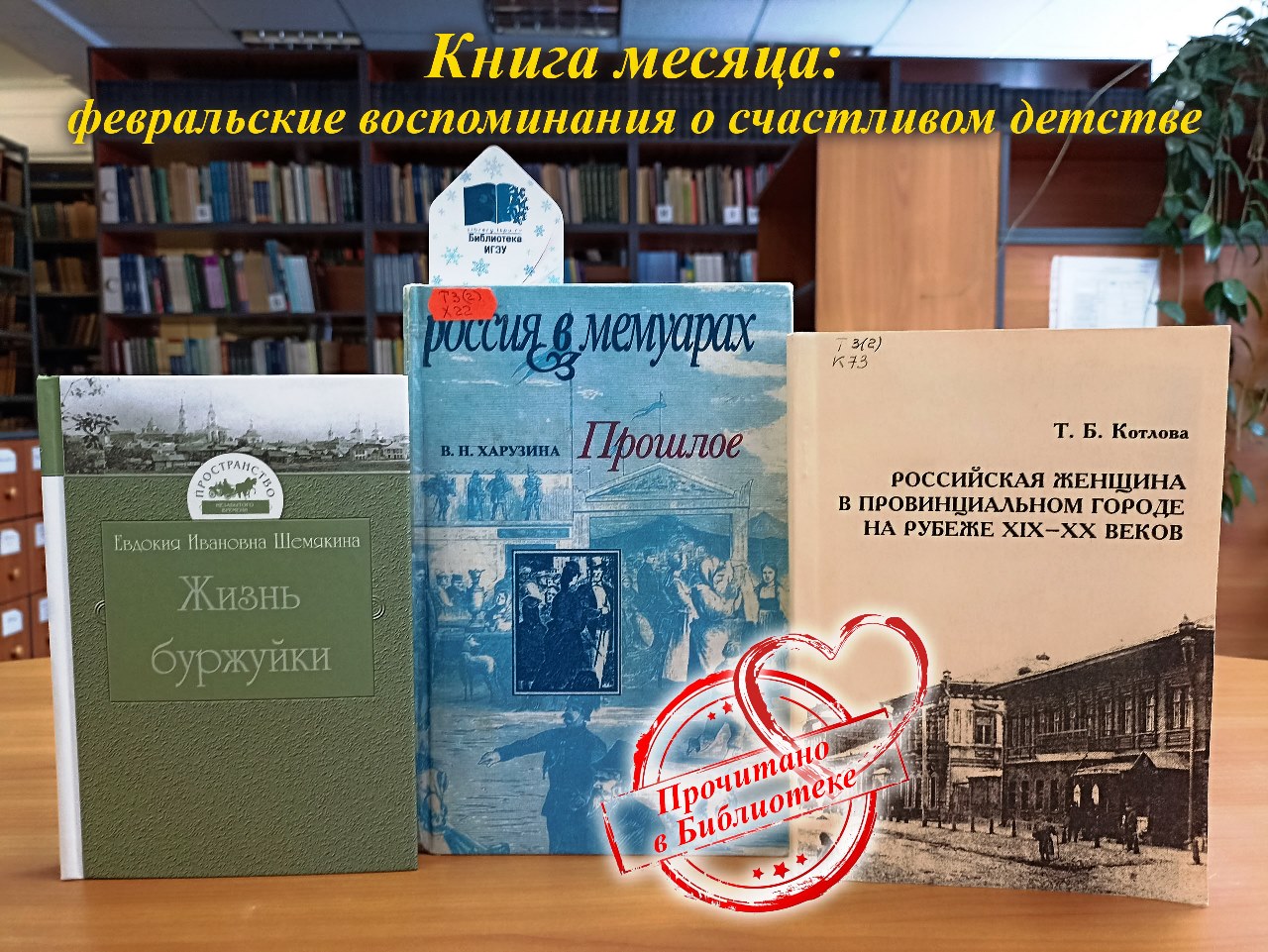 Книга В.Н. Харузиной «Прошлое. Воспоминания детских и отроческих лет» ждет вас на абонементе научной литературы. В Библиотеке вы найдете и другие воспоминания, в том числе, изданные в Ивановской области. А также книги, не только бережно восстанавливающие картину ушедшей эпохи, но и помогающие осмыслить захватывающие глобальные процессы отечественной истории.