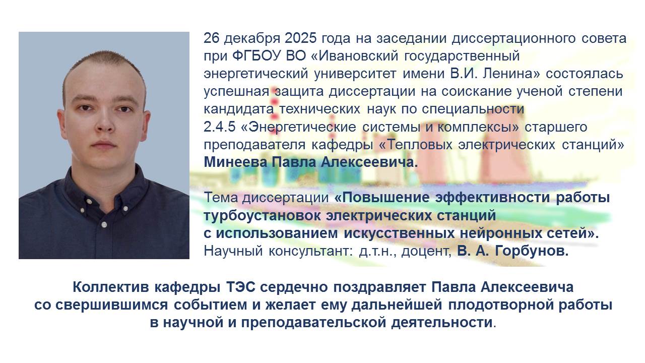 Коллектив кафедры ТЭС сердечно поздравляет Павла Алексеевича со свершившимся событием и желает ему дальнейшей плодотворной работы в научной и преподавательской деятельности.